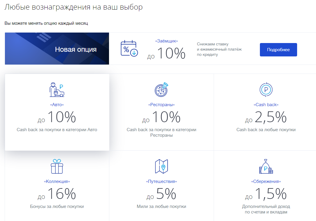 Держатель мультикарты может ежемесячно подключать 1 из 7 опций на выбор – например, повышенный кэшбэк в конкретной категории, уменьшение ставки по кредиту и др.