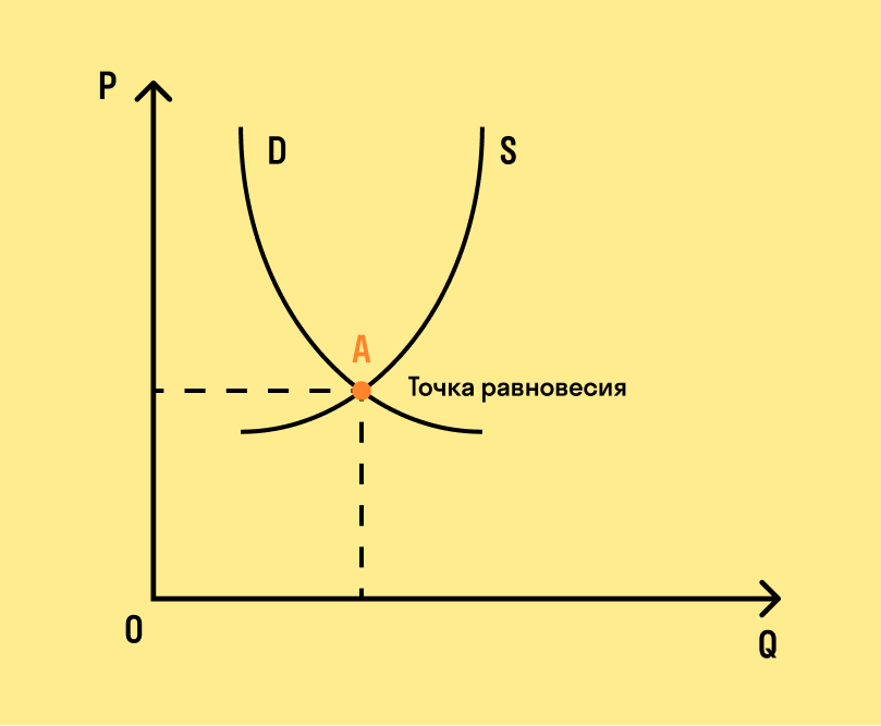 Графически пересечение кривых спроса и предложения можно отметить точкой А, которая и будет точкой равновесия. Это компромисс между желаниями и возможностями потребителя и производителя.