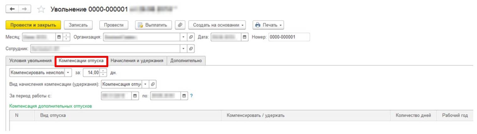 Как отразить компенсацию за неиспользованный отпуск при увольнении в 1С