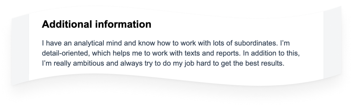 Блок Additional information подается в свободном формате. Чаще всего это простой текст на 3-5 предложений. Больше писать не стоит.
