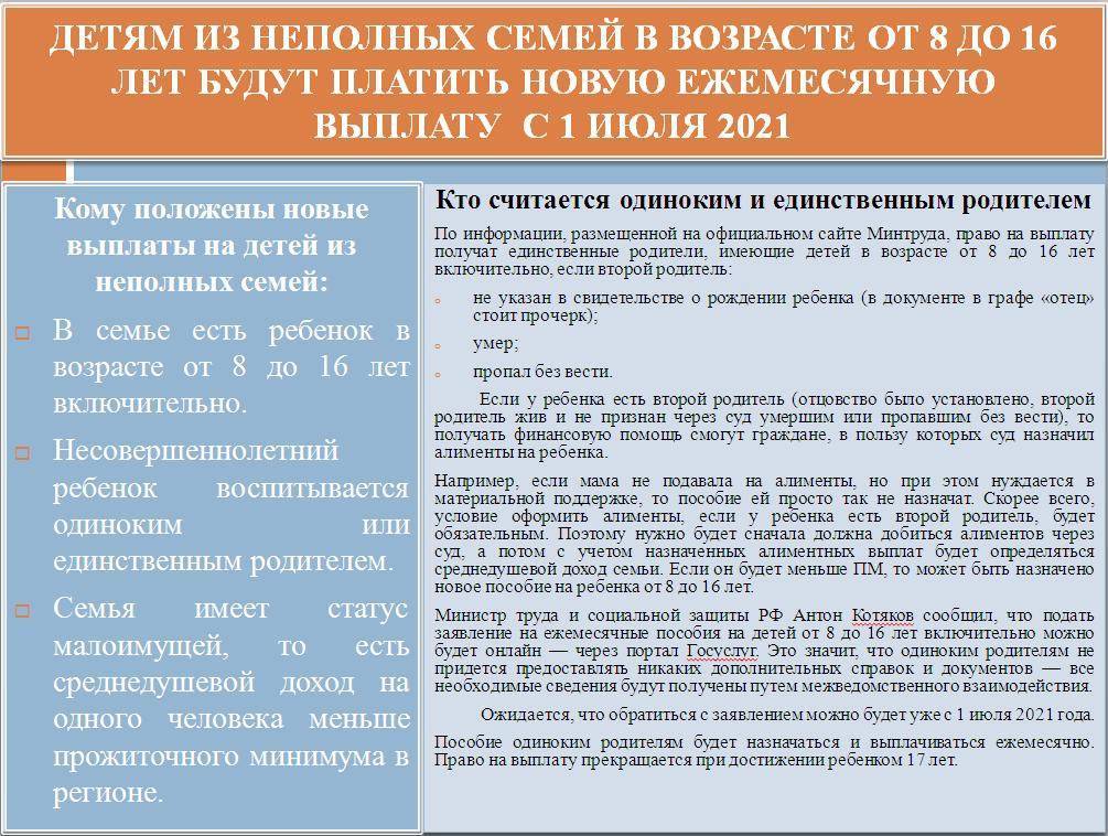 Нуждающиеся неполные семьи будут получать выплаты в размере половины регионального прожиточного минимума, установленного на ребенка, заявил 21 апреля министр труда и социальной защиты Антон Котяков, комментируя послание президента Федеральному Собранию. В среднем по стране их размер составит 5650 рублей.