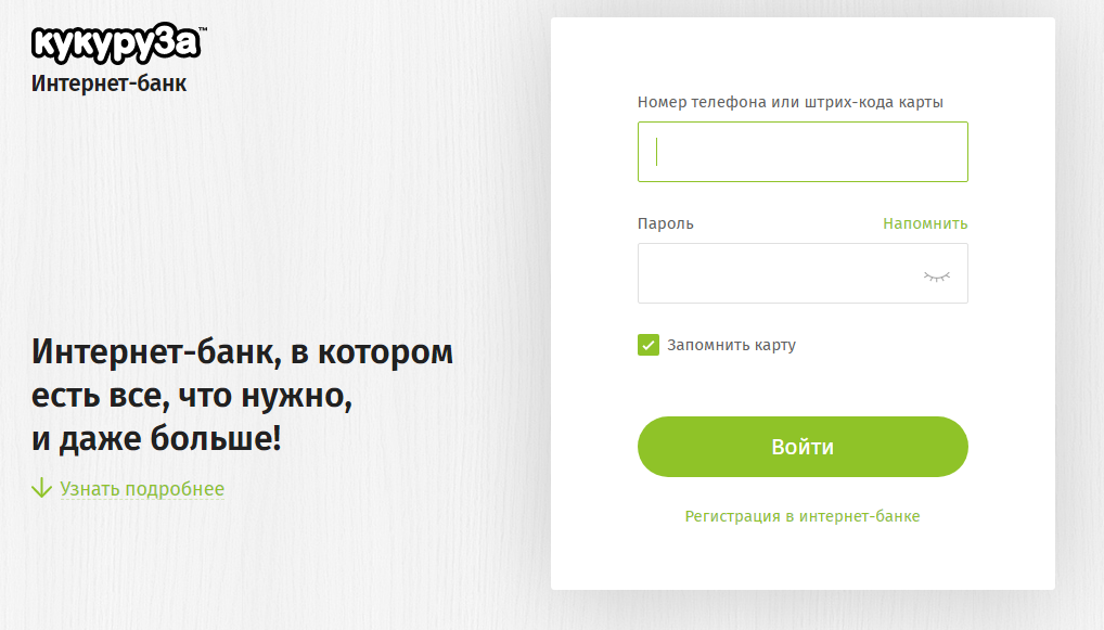Откроется страничка авторизации ЛК Кукуруза. Для того, чтобы зарегистрировать мой личный кабинет Кукуруза нужно нажать кнопку регистрации в Интернет-Банке.