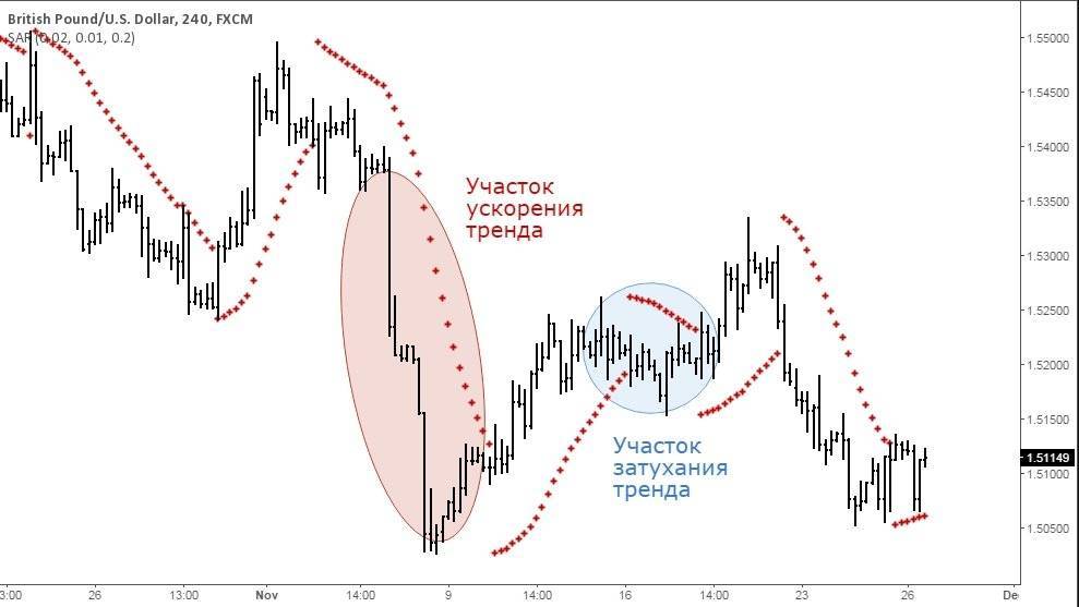 Кроме направления тренда, Параболик в некоторой степени показывает и его силу. Так, если текущий тренд ускоряется – расстояние между точками индикатора и графиком цены увеличивается. А если тренд угасает – маркеры приближаются к текущим значениям цены.