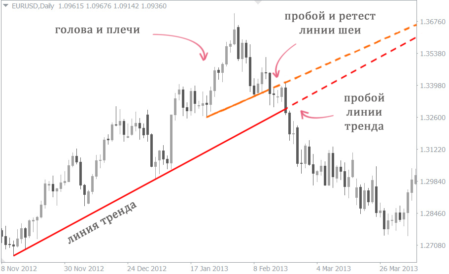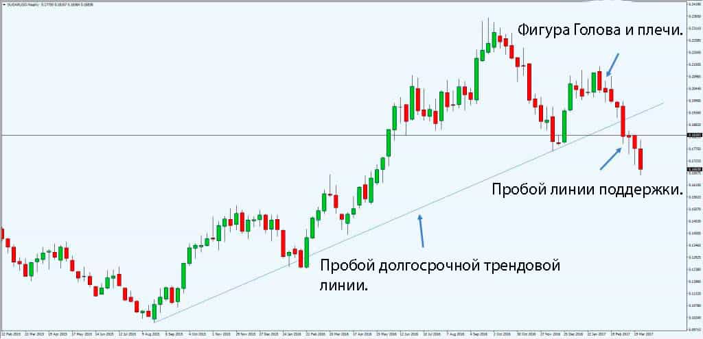 Также мы можем комбинировать данные методы с графическими фигурами движения цены. К примеру, рубежом обороны для покупателей были долгосрочная линия тренда и область поддержки. Также цена образует фигуру голову и плечи.
