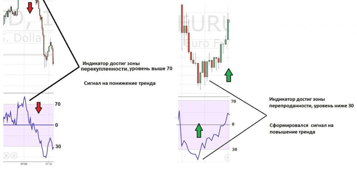 Переломные моменты (выход графика за фиксированные точки) свидетельствуют о перекупленности и перепроданности на рынке. Индекс показывает высокую эффективность при торговле бинарными опционами на Форекс. Показатель один из нескольких хорошо работает на флэте, плохо действует на высокочастотных колебаниях цен.