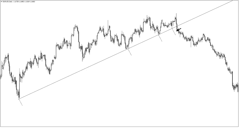 На изображении выше спрос каждый раз уменьшался после повторного тестирования линии тренда. Таким образом, рынок пытается удержать данный уровень, и цена больше не может достигать более высоких максимумов.