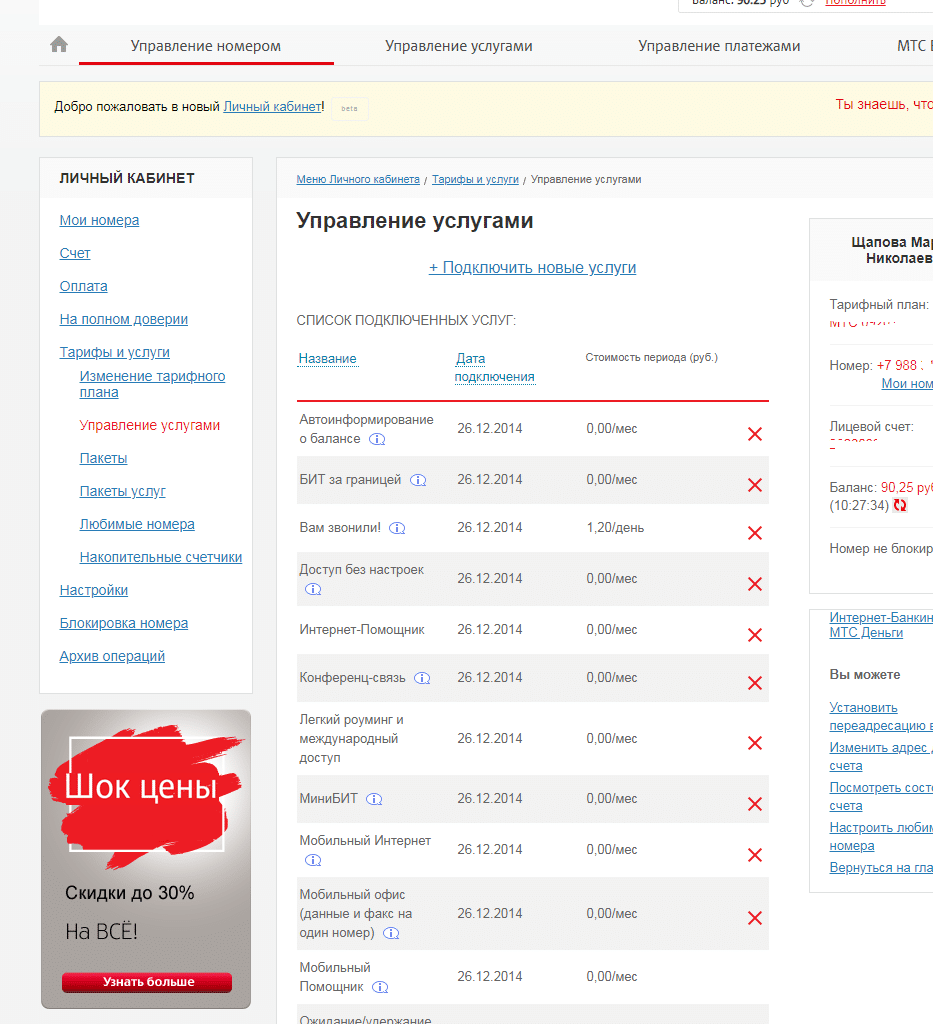После авторизации нужно зайти в пункт меню «Управление услугами». на экране откроется информация обо всех подключенных услугах.