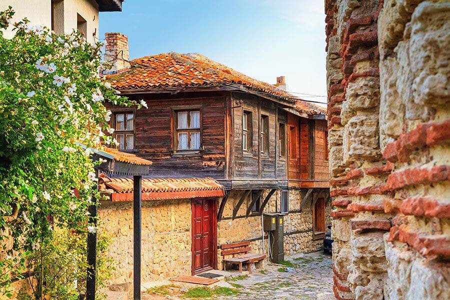 Старинная улица и дома в балканском стиле в Старом Несебру на побережье Черного моря