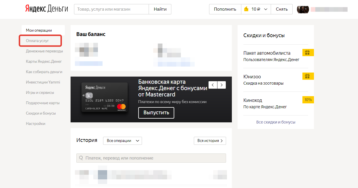 - На титульной странице в левой части личного кабинета расположена система инструментов. Здесь выбирается «Оплата услуг». В системе Яндекс.Деньги перевод на QIWI рассматривается не как самостоятельная транзакция, а как оплата определенного вида услуг. Привязка двух кошельков не производится, так как такое требование пока не выставляется (как в случае с системой Webmoney).