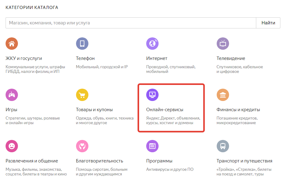 - В категориях каталога необходимо найти вкладку «Онлайн-сервисы». Также можно воспользоваться строкой поиска. В этой вкладке сгруппированы все самые популярные сервисы, аккаунты и счета которых пополняются с Яндекс.Денег.