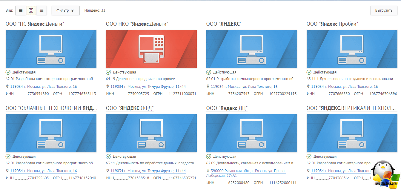 Как я и писал выше, я хочу посмотреть информацию об организации Яндекс. В красивом интерфейсе вы получаете все компании группы “Яндекс”, выбираете нужную, хотя даже уже тут видно и ИНН и ОГРН.