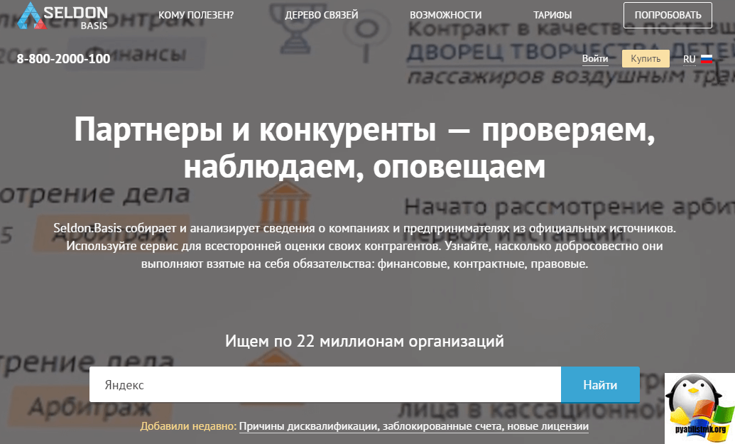И так давайте с вами попробуем произвести поиск юр лица по ИНН и наоборот. В своем примере я хочу про мониторить компанию Яндекс и узнать ее “Идентификационный номер налогоплательщика”. Все, что мне нужно это зайти на мой любимый сервис . Сам ресурс по поиску нужной нам информации бесплатный, но у него есть и очень полезная скрытая информация, о ней чуть ниже. На главной странице вы видите поисковую строку, в которой есть возможность поиска: