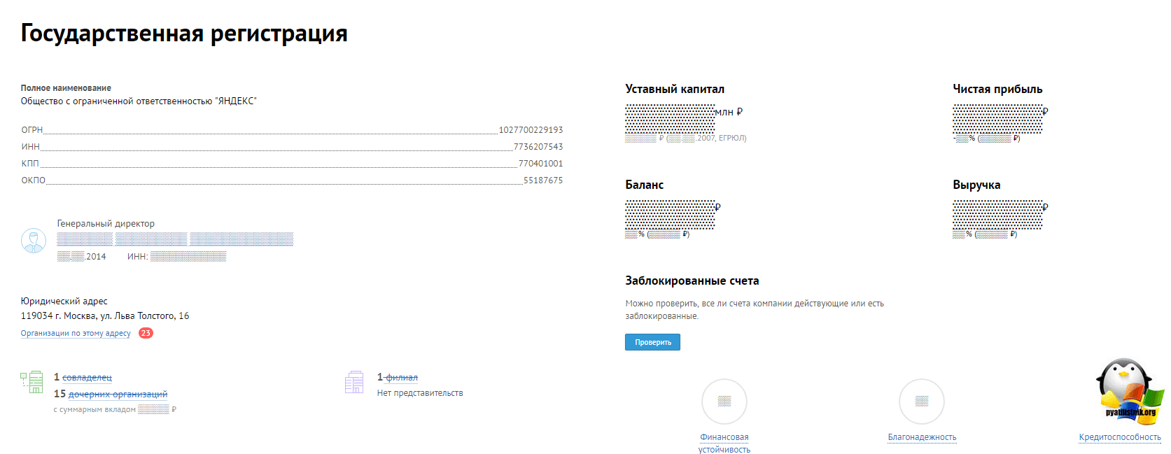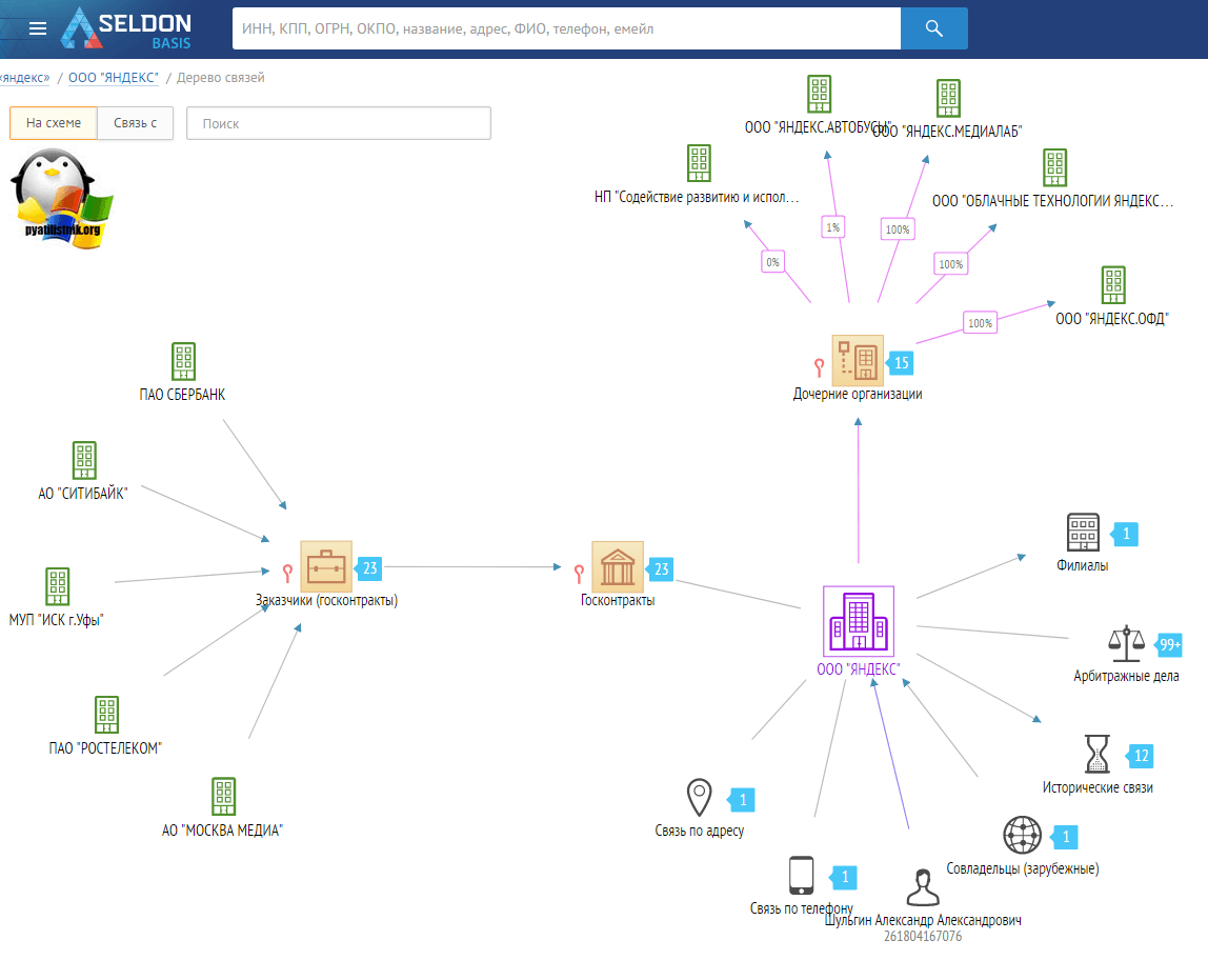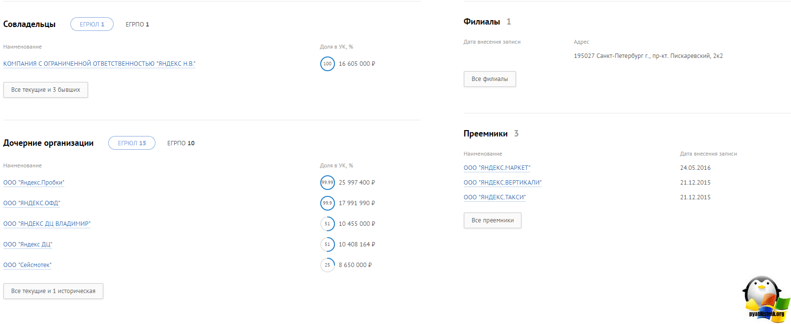 При поиске предприятия по ИНН, очень полезно знать и дочерние компании, входящие в основную, так как они могут быть не совсем добросовестные и селдон базис это вам легко покажет. Так, например, у компании Яндекс есть 15 дочерних, их доход.