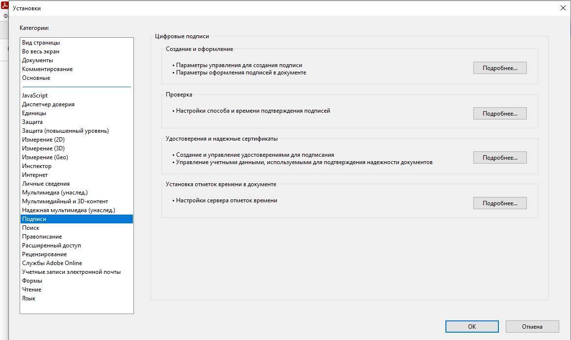 - запускаем AcrobatReader, кликаем комбинацию Ctrl+K (или используем пункты меню «Редактирование/Установки/Подписи/Создание и оформление/Подробнее»);