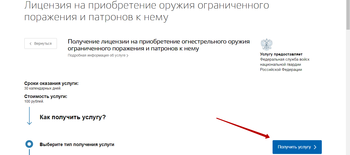 Для примера я выберу оформление разрешения на приобретения охотничьего или пневматического оружия, а также патронов к нему. Нажимаем и попадаем в раздел оформления.