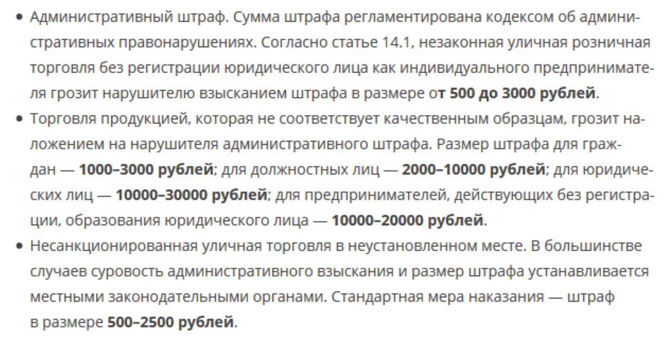 - Незаконное использование территории для торговли. Наказание в этом случае выбирается соответствующими органами, но, как стандарт, приходится платить небольшой штраф в размере 500-2500 рублей.