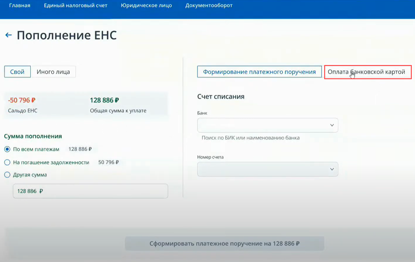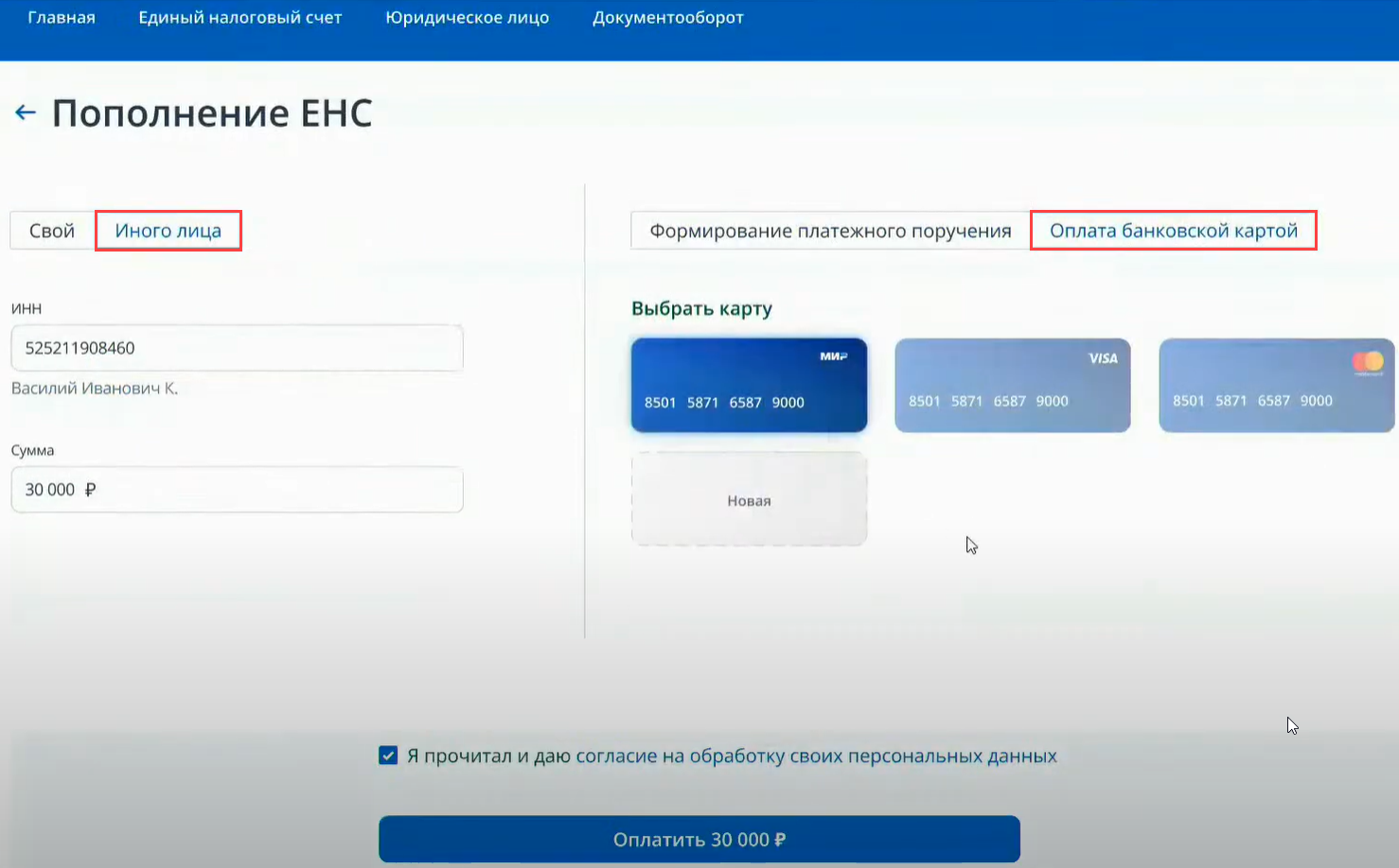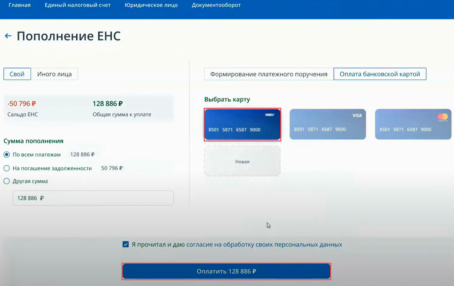 Пополнить ЕНС иного лица можно и банковской картой. Для этого в правой части экрана выберите Оплата банковской картой, потом нужную карту и нажмите кнопку Оплатить в нижней части экрана.