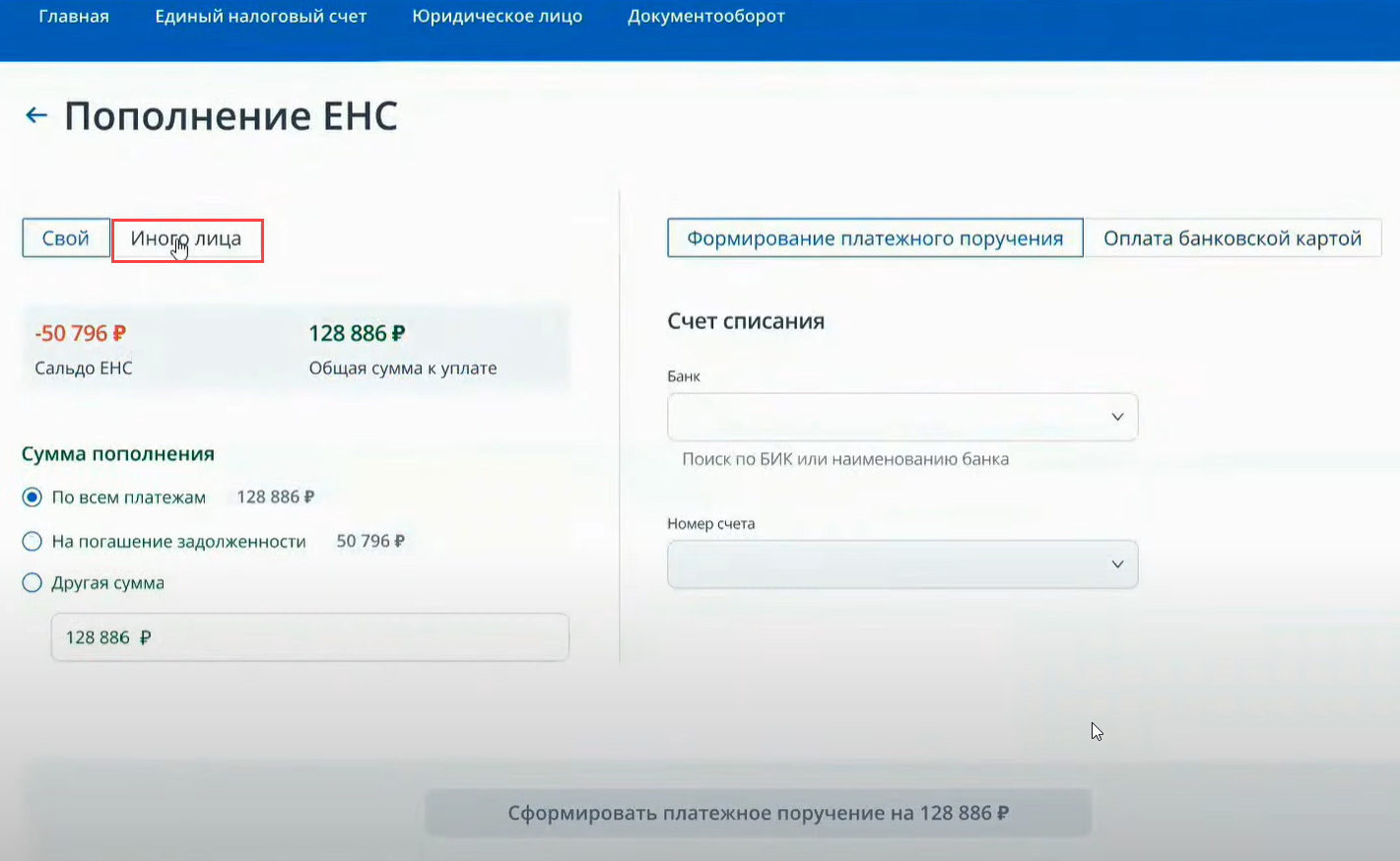 Укажите ИНН иного лица (будет выполнена его проверка) и сумму запланированного платежа в бюджет.