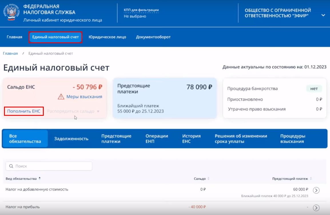 Вкладка Единый налоговый счет выглядит так: