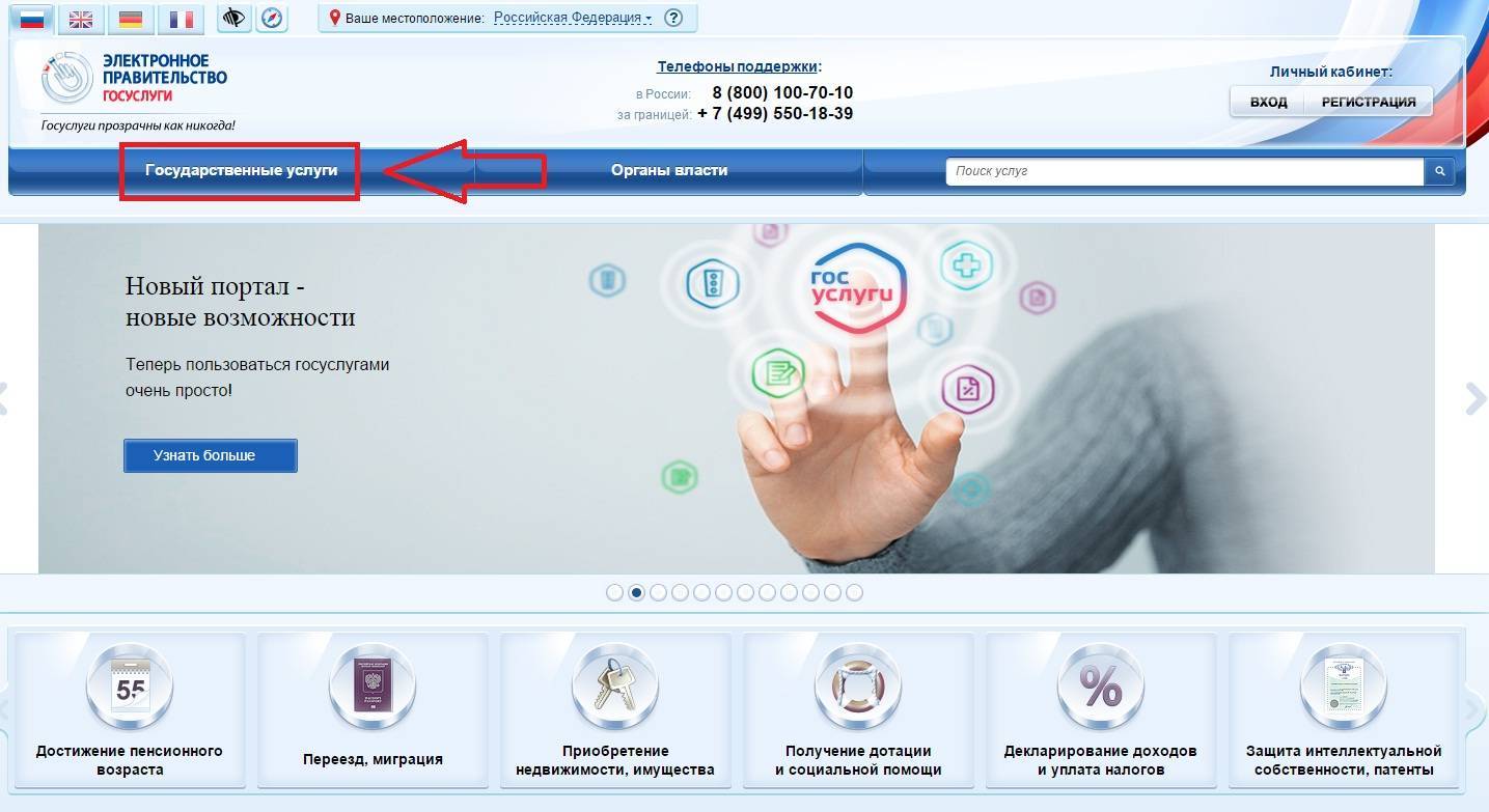 Если Вы уже зарегистрированы на этом ресурсе, то просто переходим на сайт //www.gosuslugi.ru и кликаем по вкладке «Государственные услуги».