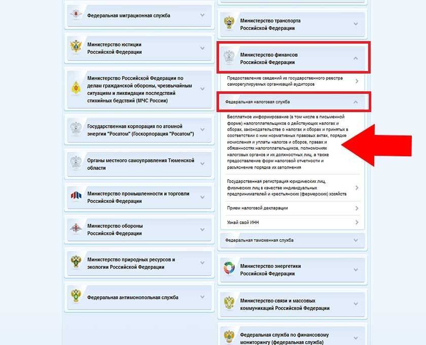 В открывшемся окне находим пункт «Министерство финансов Российской Федерации». Кликнув по нему левой клавишей мышки, выбираем в выпадающем списке «Федеральная налоговая служба», далее «Бесплатное информирование…»