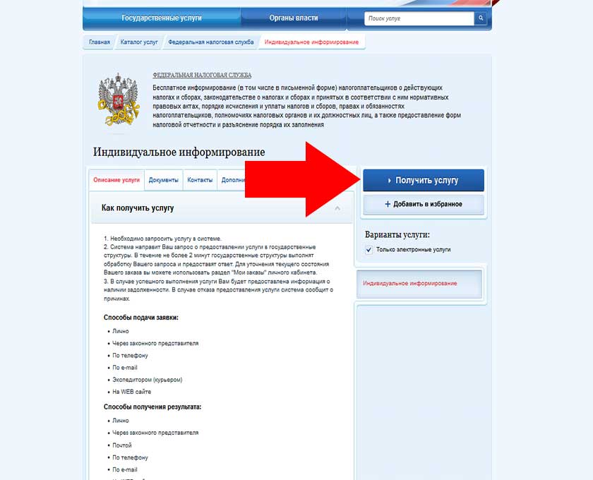 На открывшейся странице в правой части экрана перейдите по кнопке “Получить услугу”.