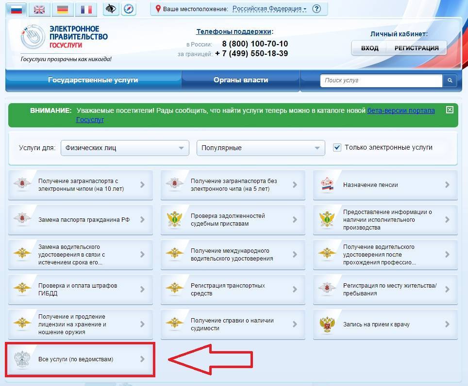 Следом попадаем на страницу услуг, где необходимо выбрать пункт «Все услуги (по ведомствам)».