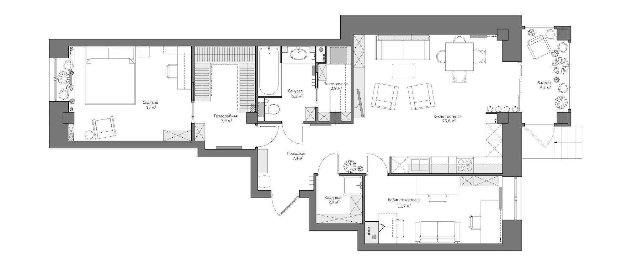 А это уже итоговый план со стенами и мебелью. Изображение: студия TB.Design