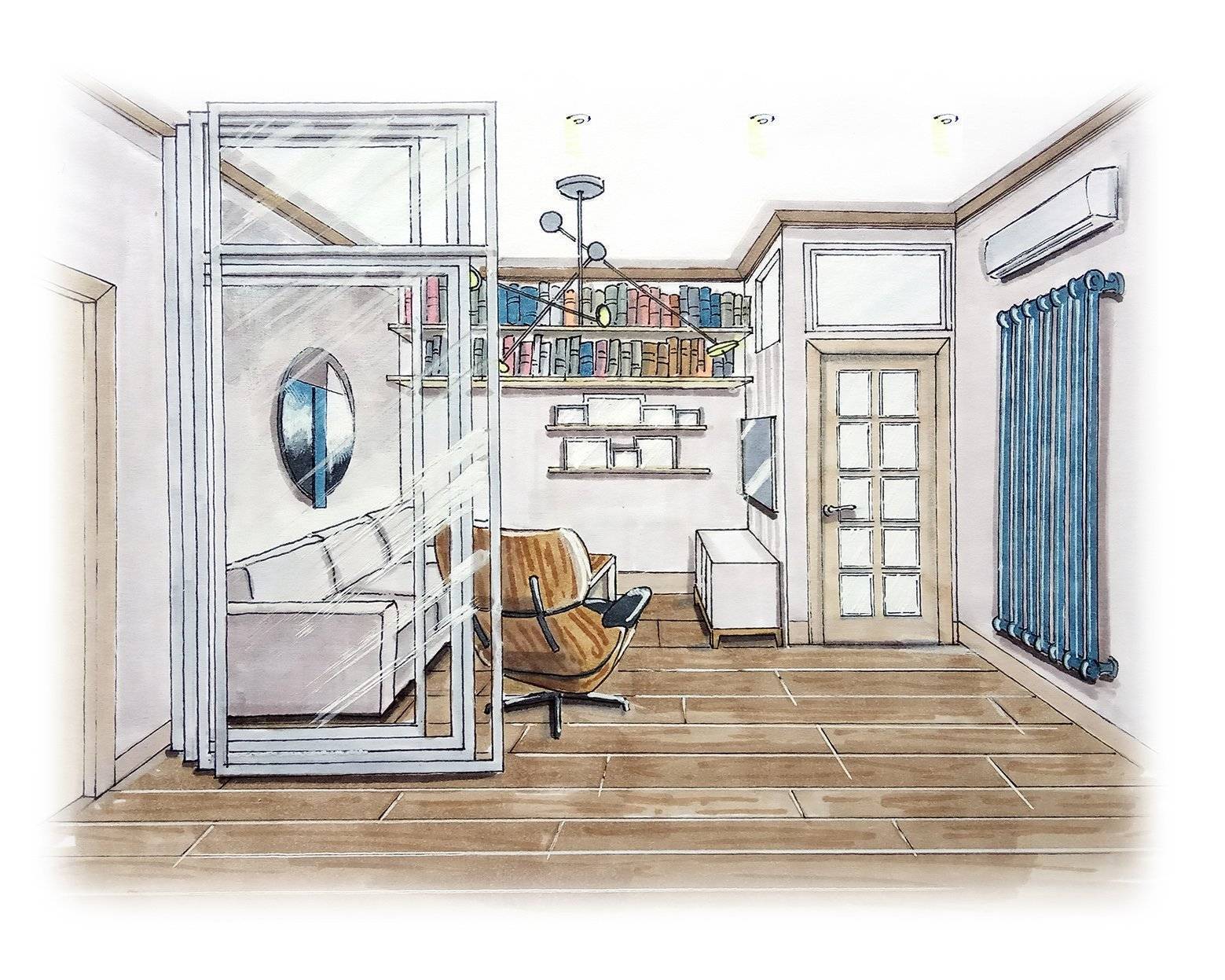 Так может выглядеть эскиз интерьера, здесь рисунок от руки. Иллюстрация: студия TB.Design