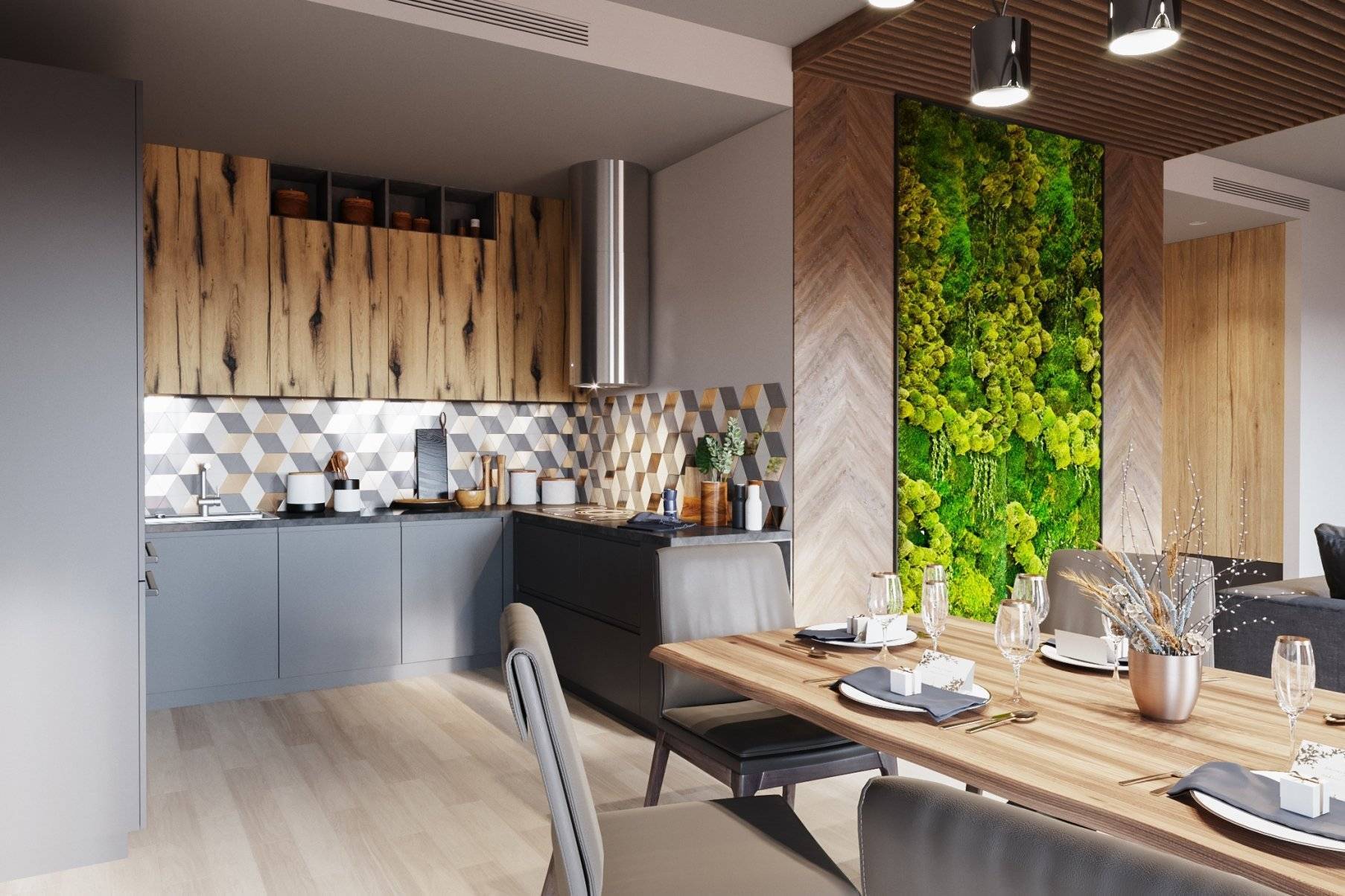 Очень круто выглядит глянцевое стекло рядом с грубым камнем; очень круто выглядят глянцевая плитка под мрамор рядом с текстурой дерева.