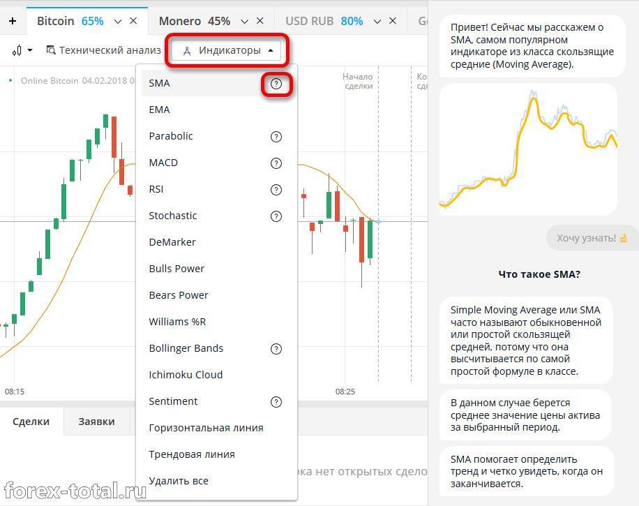 - Пользоваться индикаторами, всего доступно 24 индикатора;