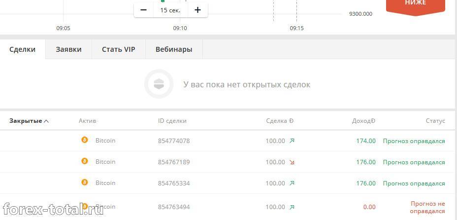 Все сделки, как открытые, так и закрытые отображаются внизу торговой платформы. В этом окне есть еще несколько вкладок. Вкладка «Заявки» расширяет возможности для открытия сделки. Здесь вы можете открыть сделку при достижении заданного времени или заданной цены актива. Во вкладке «Вебинары» можно записаться на интересующий вас вебинар. Во вкладке «Подсказки» вы можете посмотреть обучающие видео прямо в торговом терминале.