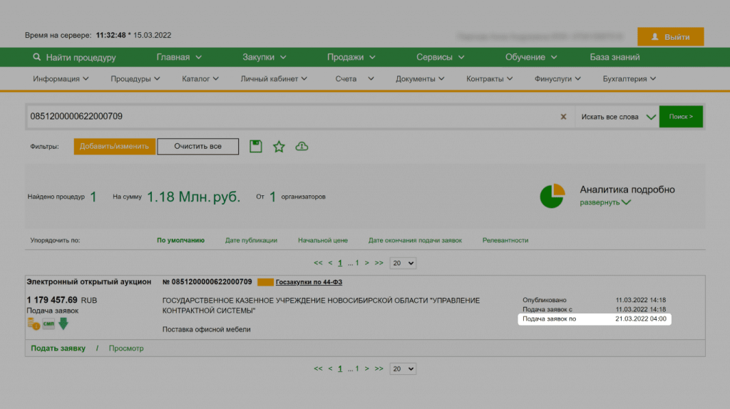 Сервис отобразит закупки по выбранным параметрам поиска.