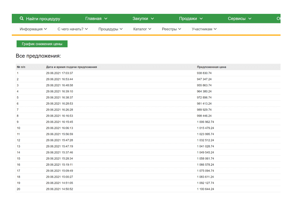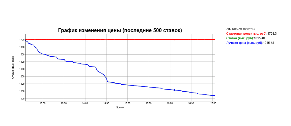 За снижением начальной цены контракта во время торгов можно следить на графике: