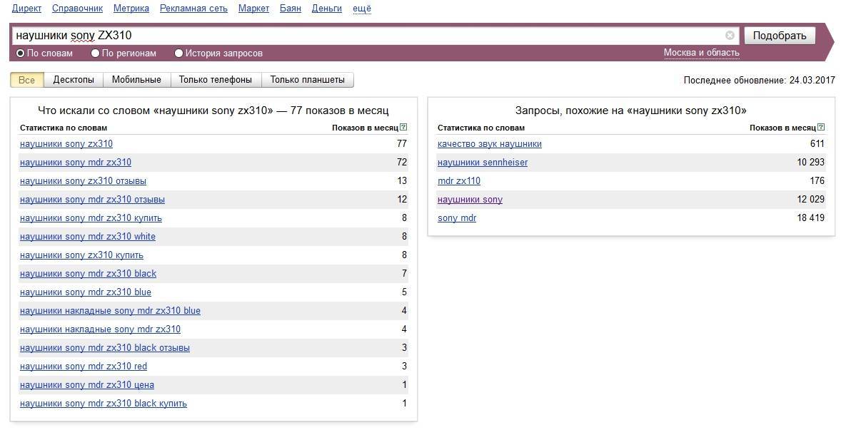 Не много получилось, в общей сложности 77 запросов. Если уберем слово «наушники», то получим больше – 321 запрос. Если переберем всевозможные варианты, включая русское написание, то в лучшем случае получится порядка 450-500 (в месяц). Что для региона «Москва и область» очень скромный показатель.