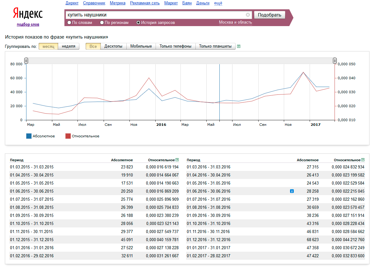 Абсолютно не лишним будет посмотреть историю запросов. Это полезно для сезонных товаров, например — купальники, мангалы, садовые инструменты и пр., запрашивают это сильно больше летом.