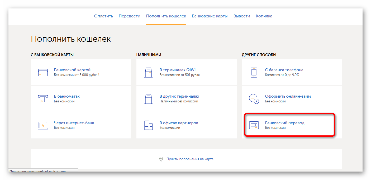 - Внизу справа найдите пункт “Банковский перевод” и выберите его.