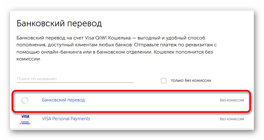 - Внизу справа найдите пункт “Банковский перевод” и выберите его.