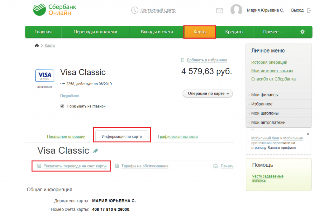 Чтобы узнать нужные реквизиты Сбербанка таким способом, введите 10-значный идентификатор из цифр и пароль из 8 символов — цифр и латинских букв. В личном кабинете выберите нужную карту, откройте вкладку «О карте», там вы увидите реквизиты карты. Этот бланк можно отправить на распечатку или на электронную почту.