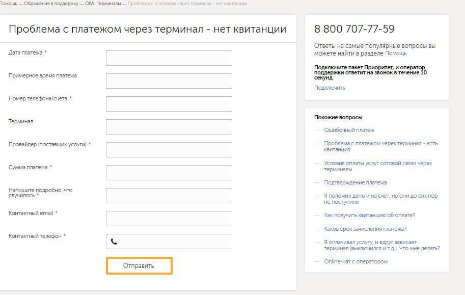 Служба поддержки Qiwi выделает отдельно ошибочные переводы, проведенные через терминал, а поэтому на официальном сайте можно найти специальную форму, которую нужно заполнять в данном случае.