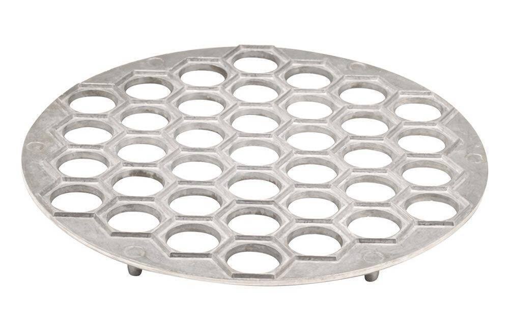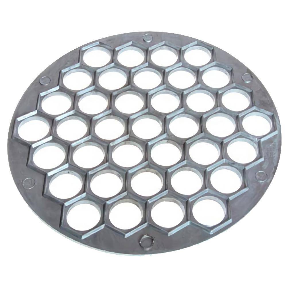 Модель изготовлена из высококачественного алюминия. Металл внушительной толщины, прочный. Конструкция представляет собой плоский круг, в котором вырезаны шестигранные отверстия. В уходе практичная, разрешено мытье посудомоечной машиной. Качественно скрепляет края теста, равномерно распределяя начинку.