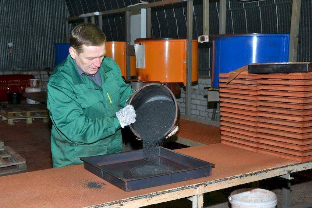 Необходимо определиться, каким способом будет производиться изготовление плитки из резиновой крошки: с ноля, когда нужно измельчать шины, или на базе готового материала. На следующем этапе можно переходить непосредственно к производству.