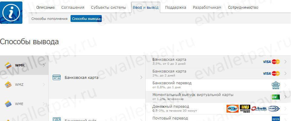 Несмотря на то, что выводить деньги с Вебмани сервиса без комиссии не получится, вы можете выбрать тот способ вывода средств, который потребует наименьших затрат и будет для вас наиболее удобным. Посмотреть процентные ставки и все возможные варианты вывода, можно на сайте самого Webmoney. Для этого вам нужно: