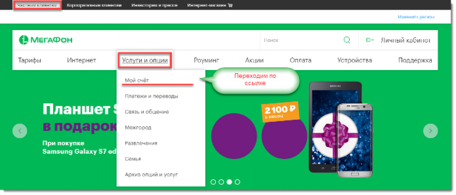Для активации услуги на ресурсе компании зайдем в пункт меню «Услуги» и выберем ссылку «Мой счет».