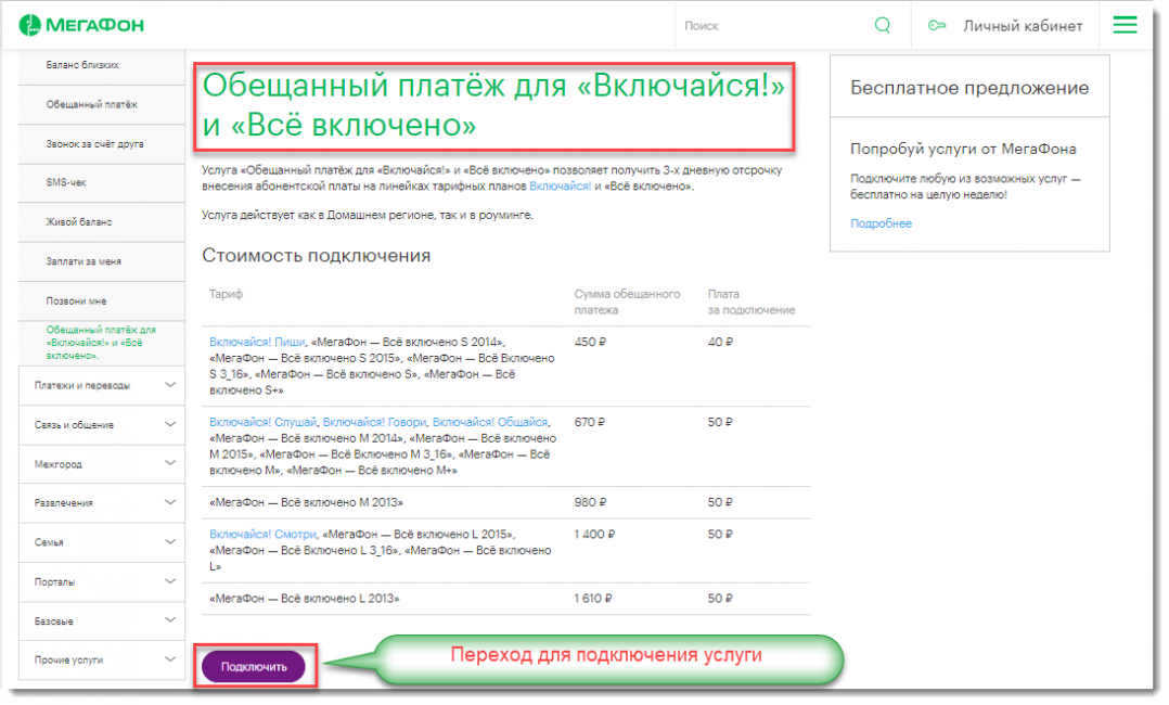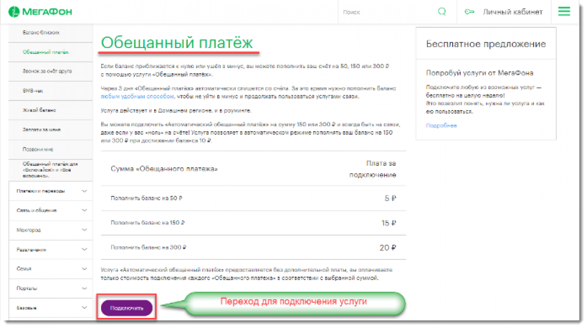 Для абонентов, тарифный план которых не предусматривает ежемесячную абонплату, предусмотрена отдельная ссылка для подключения отсроченного платежа:
