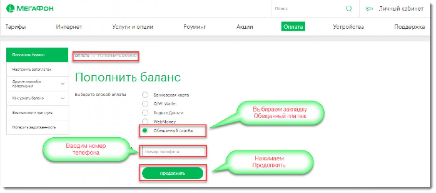 общаться по всей России. Но часто в самые ответственные моменты на счету заканчиваются все средства, а банкоматов и офисов для пополнения поблизости нет, поэтому необходимо срочно взять обещанный платеж