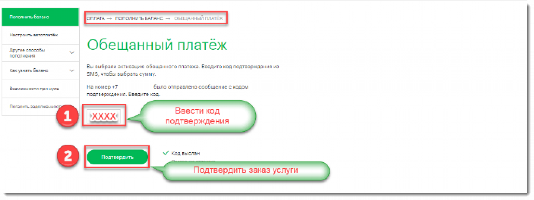 В появившейся форме вносим код, полученный с помощью СМС и подтверждаем подключение отсроченного платежа. Все готово.