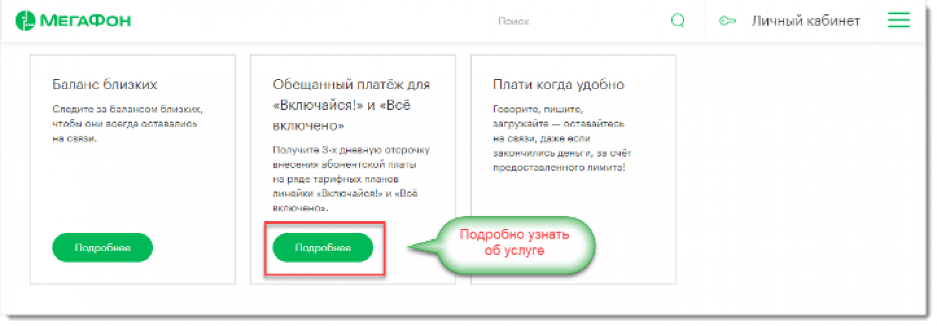 Нажав кнопку «Подробнее» перейдем на страницу, которая содержит развернутую информацию о преимуществах подключения услуги и плате на нее.