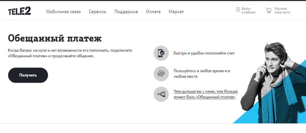 Действия для подключения какой-либо услуги на Tele2 зачастую бывают аналогичными. Обещанный платёж не является исключением, поэтому способы его получения можно разделить на 4 основных варианта: