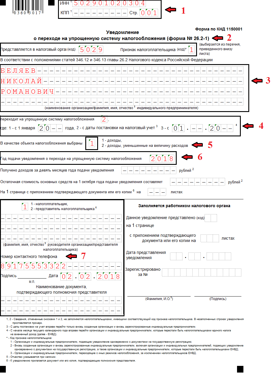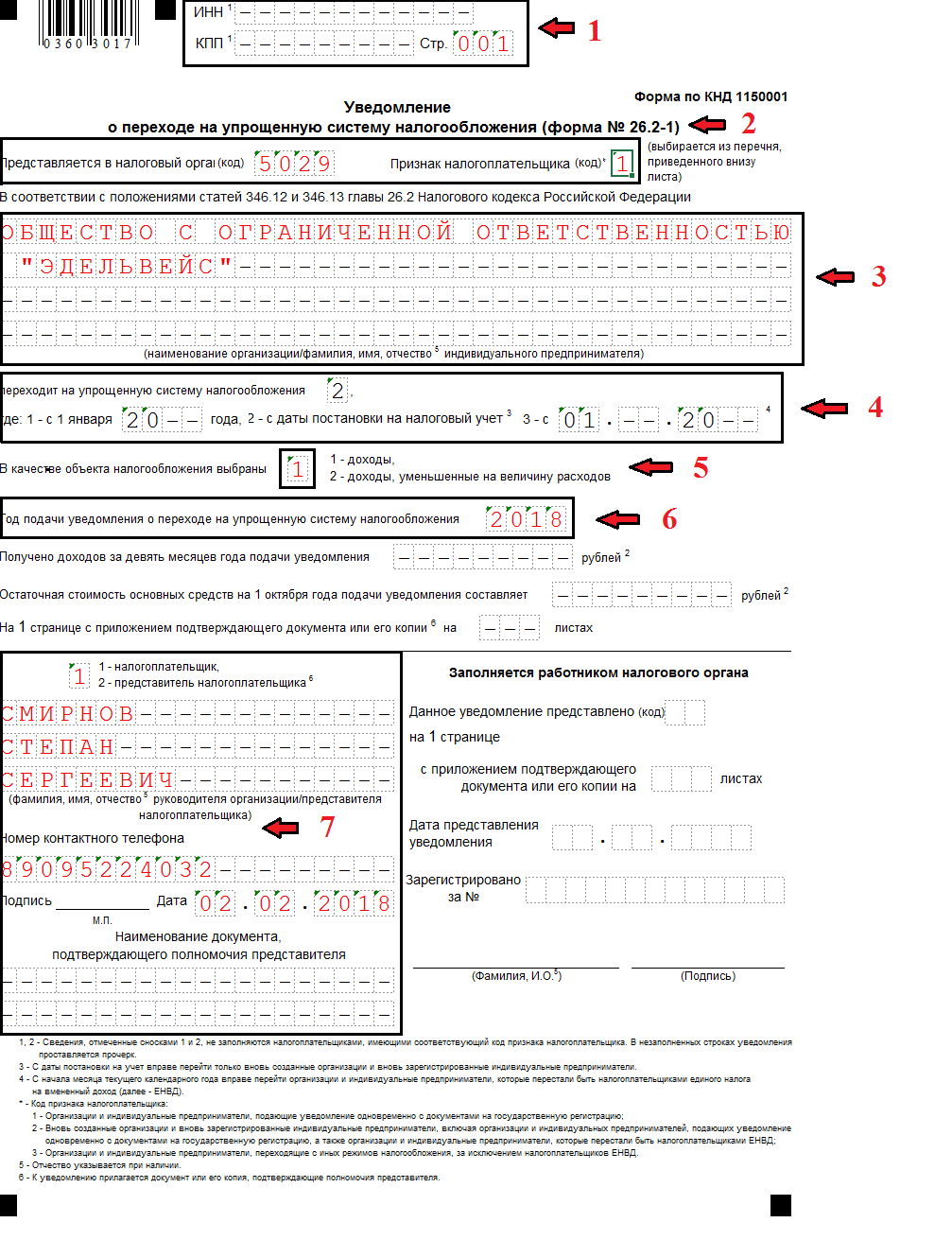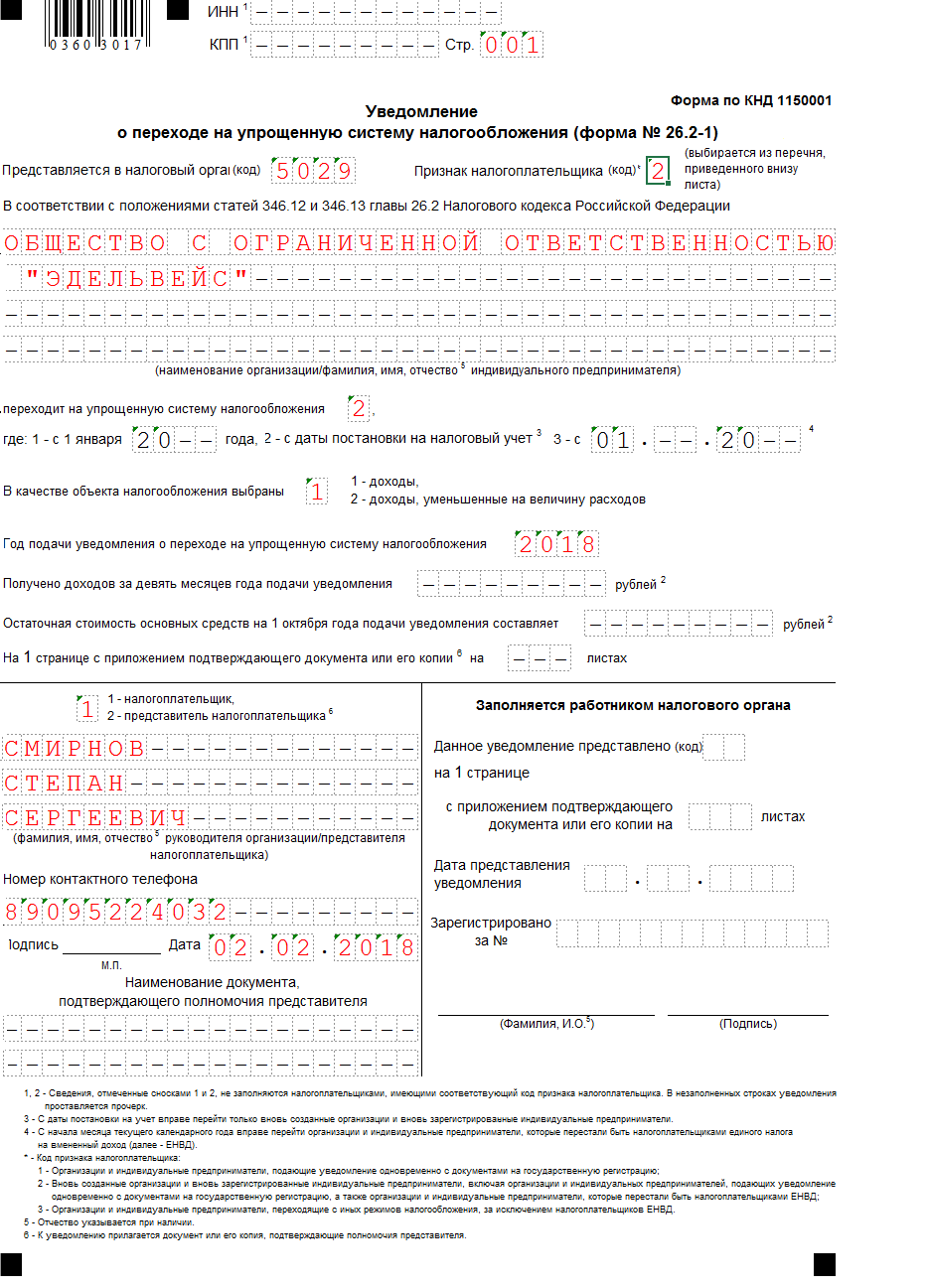 1.Первые ячейки (ИНН и КПП) заполняются уже действующими организациями, которые меняют налоговый режим. Только что созданные компании и ИП проставляют здесь прочерки.